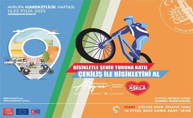 Çorum Belediyesi Avrupa Hareketlilik Haftasında bisikletle ÅŸehir turu düzenliyor, etkinliÄŸe katılanlara çekiliÅŸle bisiklet hediye ediyor. Avrupa hareketlilik haftası etkinlikleri kapsamında Çorum Belediyesi bisikletle ÅŸehir turu düzenliyor. 16.09.2022 Cuma Günü saat 18.00’da Kültür Park’tan(İtfaiye MüdürlüÄŸü Yanı) baÅŸlayacak tur Millet Bahçesinde noktalanacak. Belediye etkinlik günü Çorbis’i de ücretsiz yapacak. Katılımcıların kendi bisikletleriyle ya da Çorbis’le katılım saÄŸlayabileceÄŸi etkinlik sonrasında yapılacak çekiliÅŸle 10 adet bisiklet hediye edilecek. Çorum’un düz bir arazi üzerine kurulu bir ÅŸehir olmasının bisiklet kullanımını mümkün kıldığını belirten Belediye BaÅŸkanı Dr. Halil İbrahim AÅŸgın, “Åžehrimiz bisiklet kullanımı için oldukça elveriÅŸli bir ÅŸehir. Bisikletin ulaşım aracı olarak kullanılmasını yaygınlaÅŸtırmak ve hemÅŸehrilerimizi buna teÅŸvik etmek için çeÅŸitli uygulamaları hayata geçiriyoruz. Bu anlamda ÇORBİS ÅŸehrimize kazandırdığımız bir alışkanlık oldu ve çok sevildi. 40 bini aÅŸan abone sayısı da bize bunu gösteriyor. Avrupa Hareketlilik Haftası dolayısıyla yapacağımız bisikletle ÅŸehir turu etkinliÄŸimize tüm hemÅŸehrilerimizi davet ediyorum” diye konuÅŸtu.