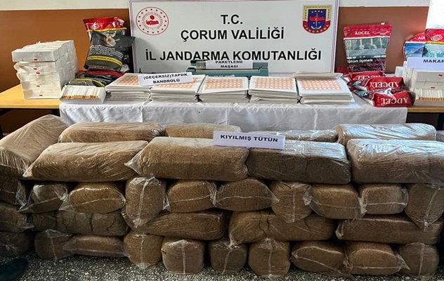 Çorum İl Jandarma Komutanlığına baÄŸlı ekipler tarafından Osmancık ilçesindeki bir köye düzenlenen operasyonda çok miktarda kıyılmış tütün, sahte bandrol ve makaron sigara ele geçirildi.
