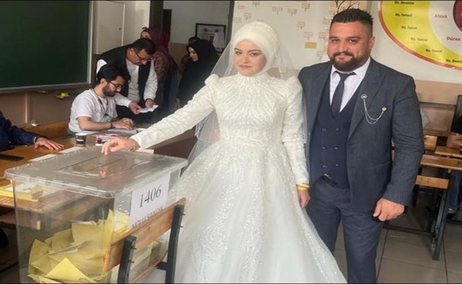 Çorum’da bir çift, düÄŸün töreni öncesi gelin ve damatlıklarıyla sandık başına giderek oy kullandı. 2. Tur CumhurbaÅŸkanlığı Seçimleri için Çorum’da oy verme iÅŸlemi sürüyor. Bugün dünya evine girecek olan Seyit Ahmet ve Gülen çifçi de düÄŸünleri öncesinde Yavuz Sultan Selim Ortaokulu ve Mehmetçik Lisesi’ne gelerek oylarını kullandı. Oylarını kullanan genç çifte, vatandaÅŸlar da mutluluk diledi. 3.240 EriÅŸilen KiÅŸiler 132 EtkileÅŸim Tüm ifadeler: 2121